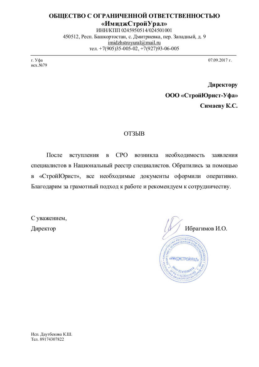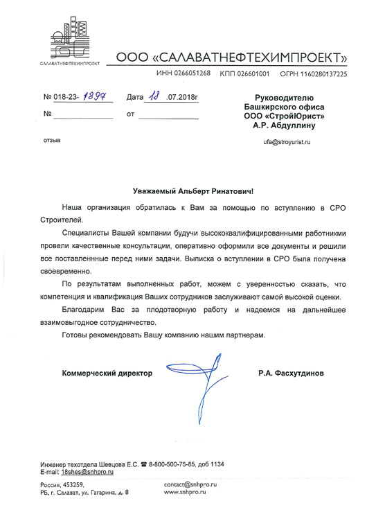 Отзывы клиентов "СтройЮрист" по вступлению в СРО в Нижнекамске